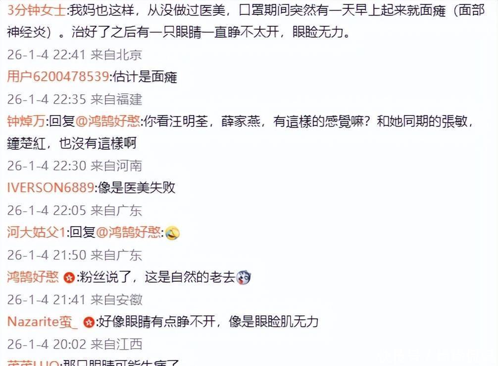 有人称这种现象为“眼睑肌无力”,更有人解释称王祖贤左眼的状况与其母亲的经历相似:从未做过医美,但突然之间就患上了面部神经炎,也就是我们常说的面瘫。不过也有人怀疑她是医美失败。