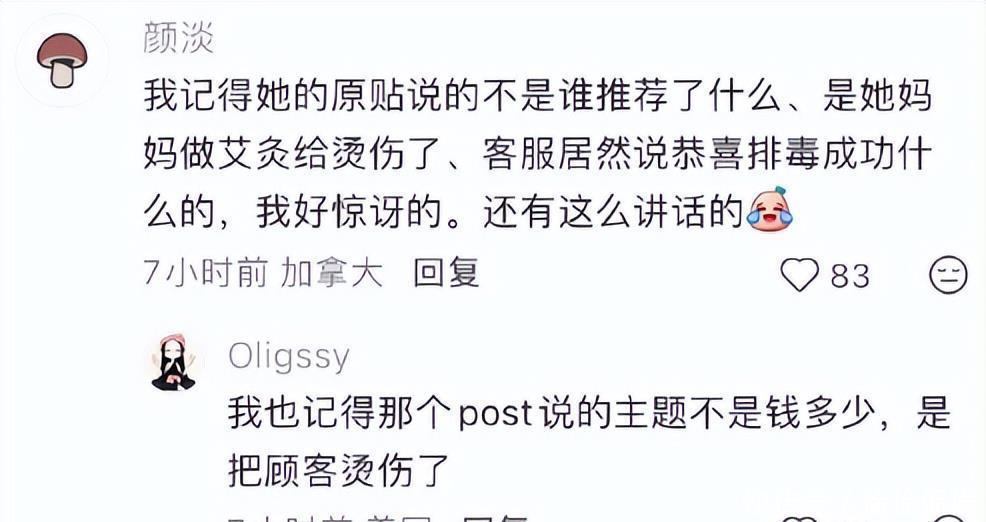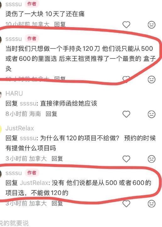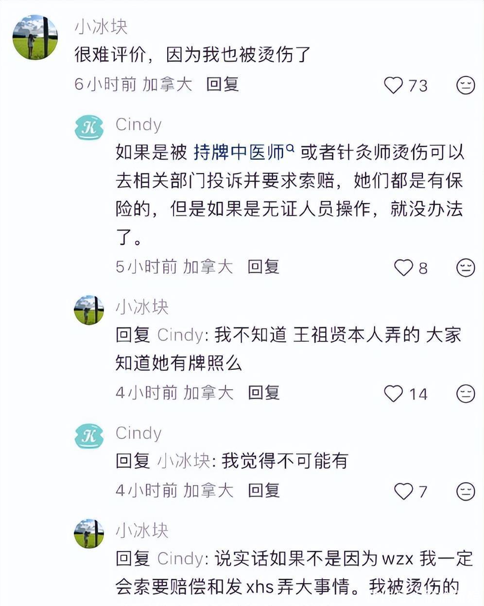还有网友发帖吐槽她不仅被烫伤了,店里还不接受做最低消费的艾灸,王祖贤对该网友推荐了最贵的盒子灸。但也有人回复她说做艾灸被烫出气泡是正常现象。