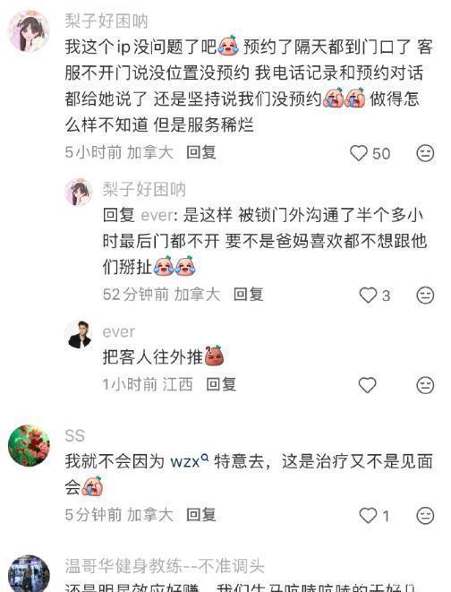 除了消费率高,艾灸馆的体验也一度被诟病。有不少加拿大网友在某平台爆料称服务差劲,有预约后到店不承认的现象,甚至有在艾灸时被烫伤的现象,但大家都看在王祖贤明星的面子上并不想把事情闹大。